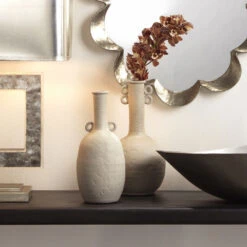 Inspired by the earthy elements of traditional ceramic pottery, this vase features an elongated neck and geometric accents for visual interest. Its neutral tones make it a go-to for all seasons as you swap out dried florals. Display in singles or in multiples for a stricking presentation.