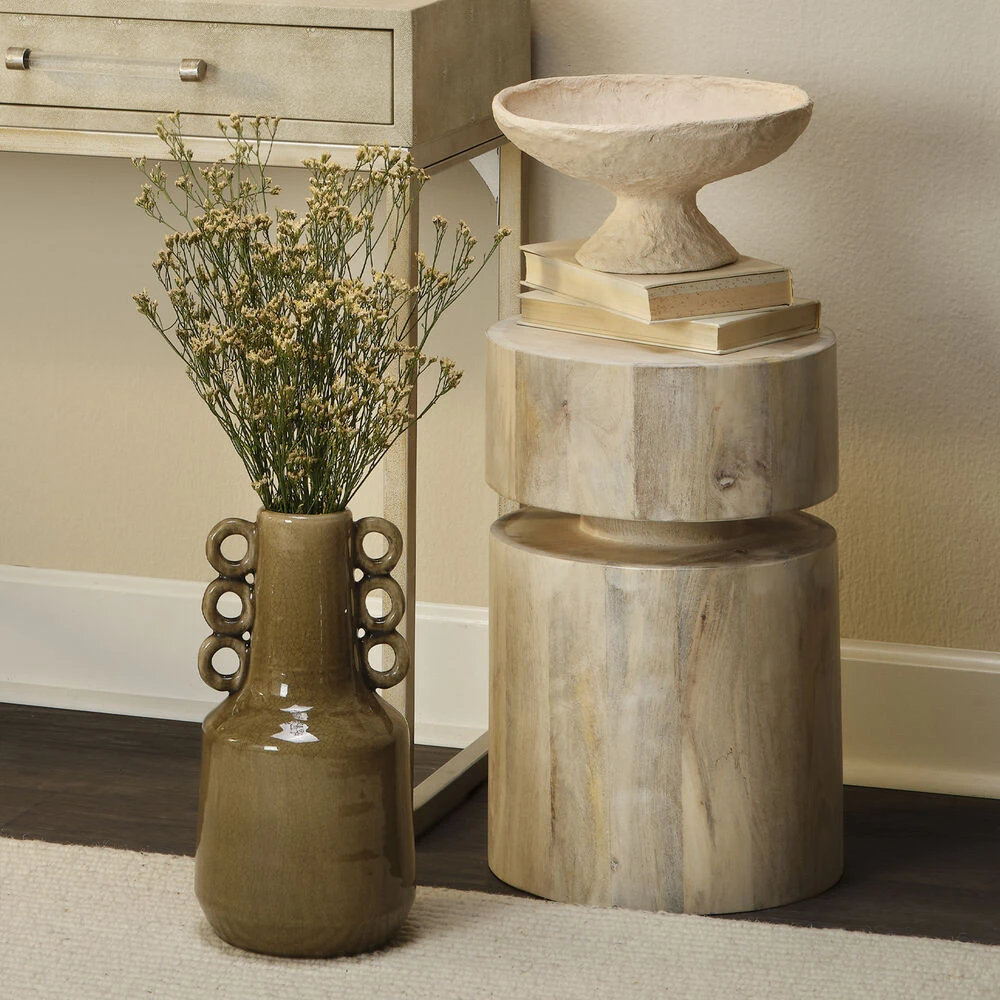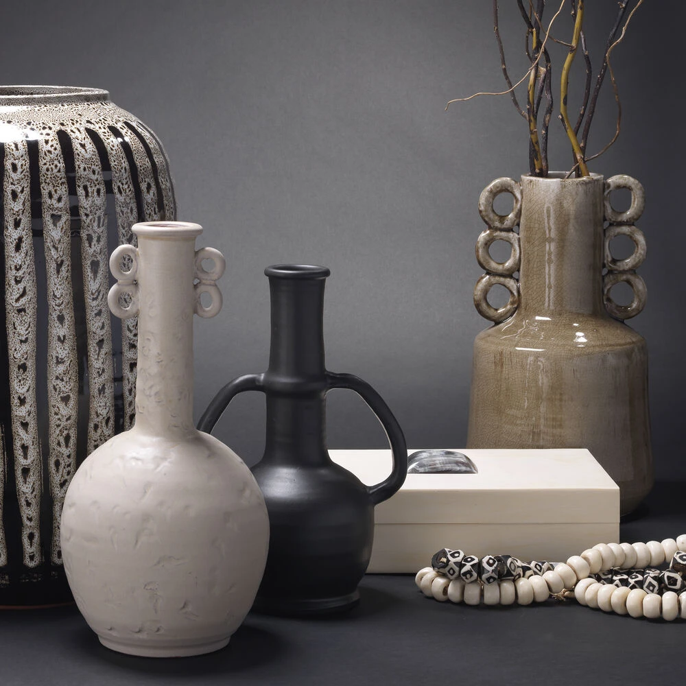 Add maximum style with minimum effor with these vases. Hand crafted of ceramic, its silhouette is adorned with three open handles on each side and finished with a reactive taupe glaze for a contemporary feel. Place on any table top and display your favorite florals.