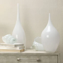 Equal parts elegant and organic, this set of three vases bring ethereal beauty to any tabletop. Its voluptuous silhouette is meticulously hand blown of glass and finished in milky white. Grouped together or separately, the posibilities are endless!