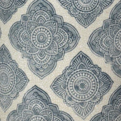 This cannister is a simple contemporary column shape in a sophisticated Arabic indigo pattern, repeated over a bone white porcelain background.
