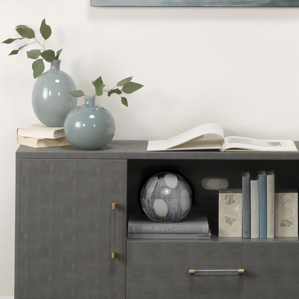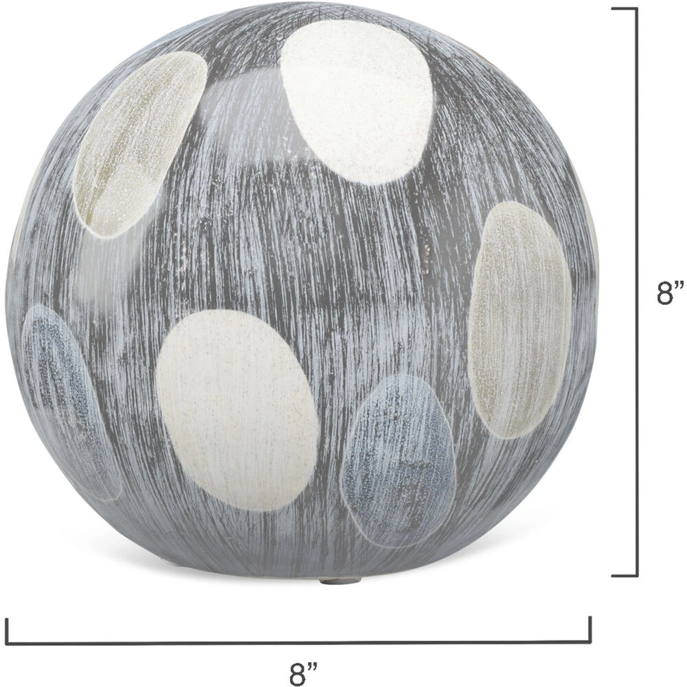 These mesmerizing ceramic orbs are hand finished in an organic pattern of cream, blue, black, and white. Inspired by the play of light and shadow on the cobblestone alleys of Europe, they add an undeniable sense of sophistication to any home. Place alone or in pairs on a console, bookcase or side table for a look of organic refinement.