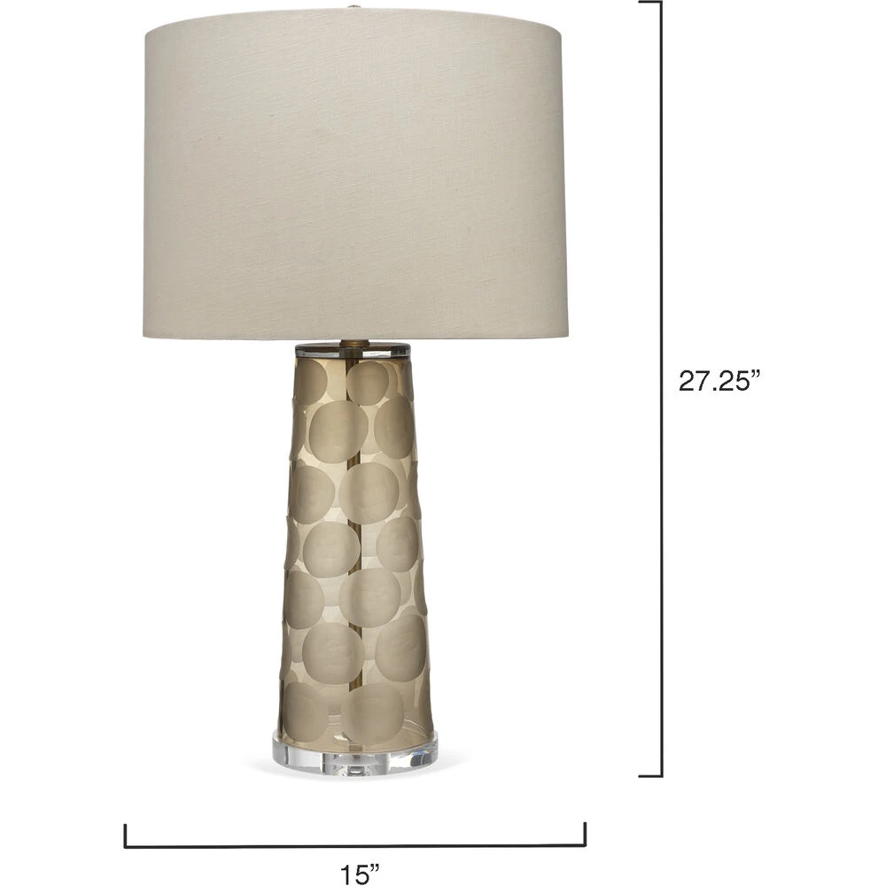 This mouth blown glass lamp in soft taupe has a monochromatic pattern of organically shaped taupe circles, making our Pebble lamp a playful but sophisticated piece.