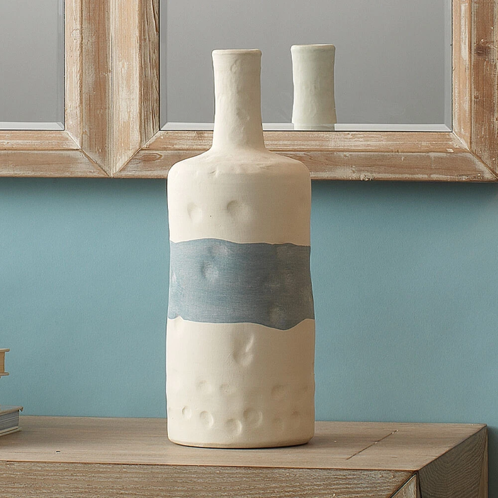 This set of vessels is ready to style any table top or windowsill it meets. Crafted and glazed by hand, these ceramic vessels feature an organic shape and imperfect lines in matte blue and white. Show off your favorite bundle of faux florals or let these vases wow on their own.