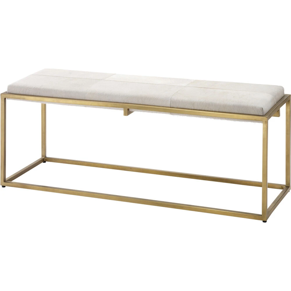 A soft hide seat and a sleek, architectural metal frame come together in the art-deco inspired Shelby bench. Featuring hand-forged legs and topped with padded seat for extra comfort. The high-contrast materials make for a striking accent pulled up to a dining table, welcoming entryway or at the foot of your bed.
