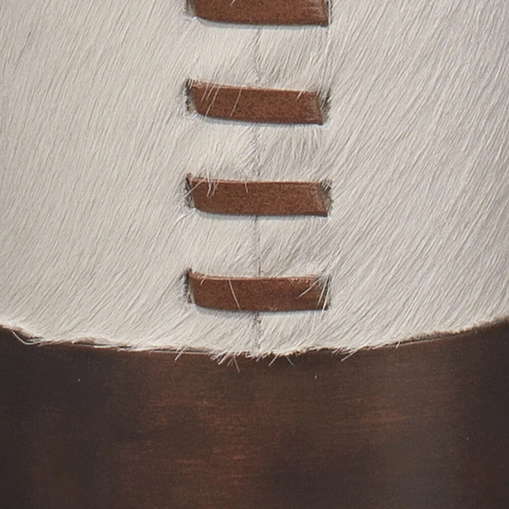 Warm oil rubbed bronze is wrapped in white hair-on hide in this exceptional lighting option. The hides for each are selected by hand; no two hides will be identical. Their masculine edge is enhanced with a bronze finial and softened with an off-white linen drum shade, resulting in a unique choice for study, living area, or den.